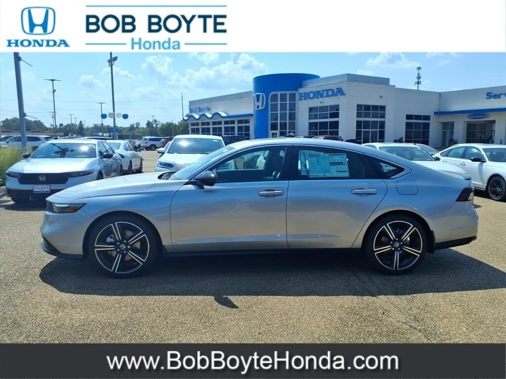 2025 Honda Accord Hybrid Sport Solar Silver Metallic FWD 2.0L I4 DOHC 16V eCVT Bring Us All Offers On This Vehicle, Honda Dealer Serving Jackson MS, Financing Is Available For Everyone, 2.0L I4 DOHC 16V, 8 Speakers, Adaptive Cruise Control: Adaptive Cruise Control (ACC) with Low-Speed Follow, Alloy wheels, AM/FM radio, Apple CarPlay/Android Auto, Auto High-beam Headlights, Automatic temperature control, Blind Spot Information (BSI) System warning, Brake assist, Delay-off headlights, Dual front impact airbags, Dual front side impact airbags, Electronic Stability Control, Emergency communication system: HondaLink, Exterior Parking Camera Rear, Fabric Seat Trim, Four wheel independent suspension, Front Bucket Seats, Front dual zone A/C, Fully automatic headlights, Heated Front Bucket Seats, Heated front seats, Illuminated entry, Knee airbag, Lane departure: Lane Keeping Assist System (LKAS) active, Leather Shift Knob, Leather steering wheel, Occupant sensing airbag, Overhead airbag, Panic alarm, Power driver seat, Power moonroof, Power steering, Power windows, Radio data system, Radio: 180-Watt Audio System, Rear side impact airbag, Remote keyless entry, Security system, Speed control, Speed-sensing steering, Speed-Sensitive Wipers, Spoiler, Steering wheel mounted audio controls, Traction control, Variably intermittent wipers, Wheels: 19" x 8.5J Berlina Black. 46/41 City/Highway MPG